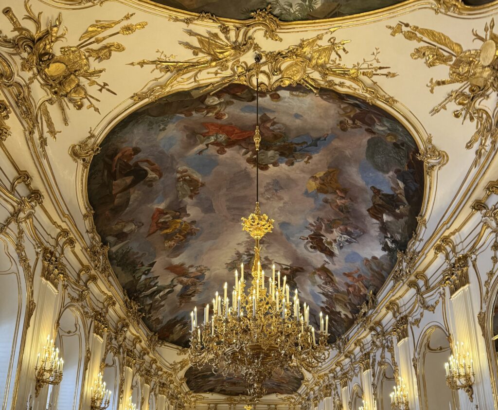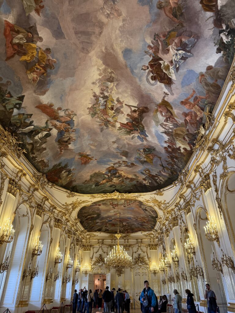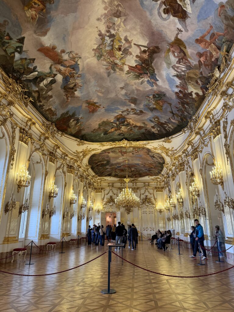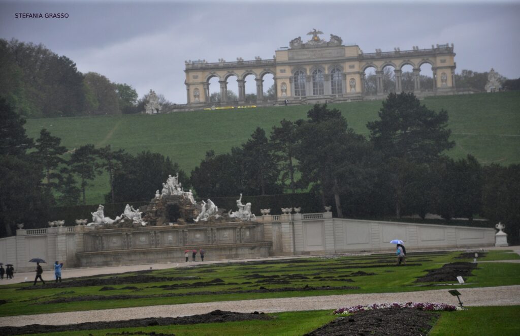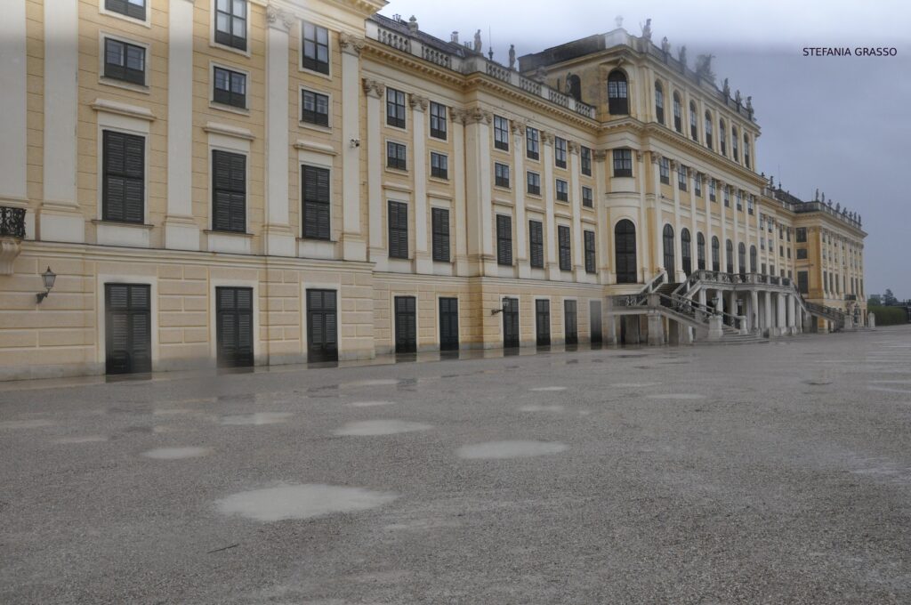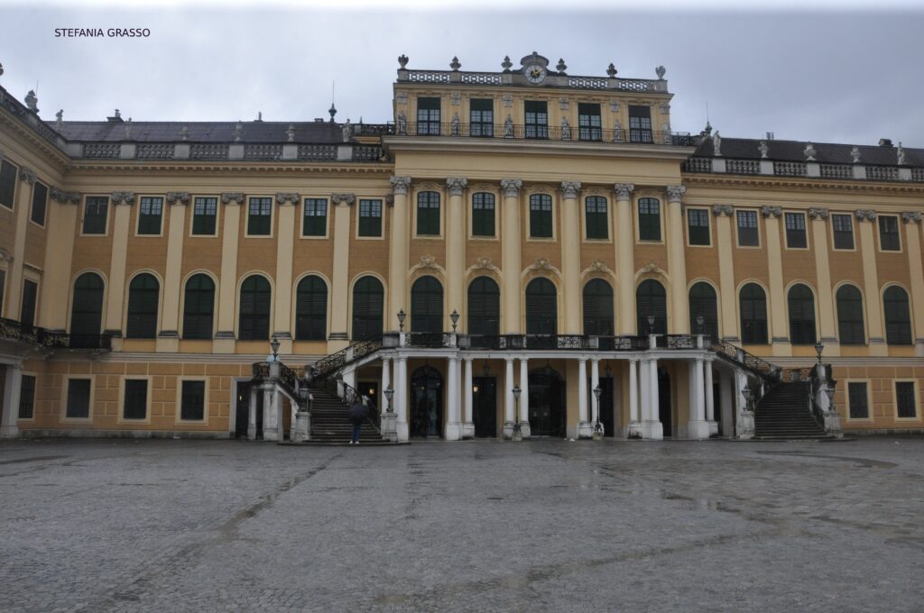 Il tempo inizia a peggiorare mentre di fronte a noi emerge imponente la reggia di Schönbrunn, piove a dirotto davanti all’insegna luminosa “Wilkommen”. In stile Versailles, il castello risale al 1700 e presenta un’architettura barocca in giallo ocra mantenendo il suo aspetto originale nonostante diversi interventi di restauro. Esso consta di 44 sale ed è patrimonio UNESCO. Il parco circostante presenta delle statue legate alla mitologia greca e latina.