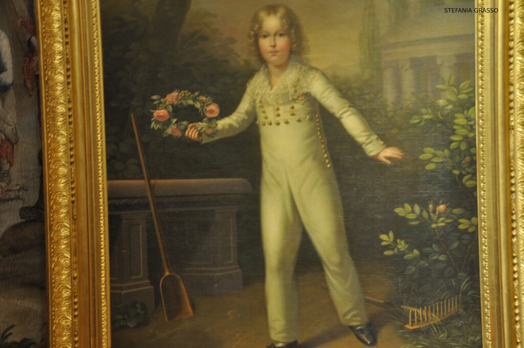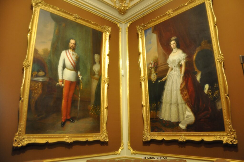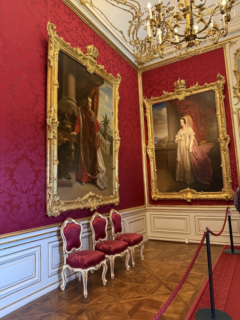 Salone rosso. Ritratto dell’imperatore Francesco sulla sinistra, ritratto di Maria Leopoldina, appassionata di Scienze Naturali. Roter Salon. Links ein Porträt von Kaiser Franz, links ein Porträt von Maria Leopoldine, einer leidenschaftlichen Naturwissenschaftlerin.