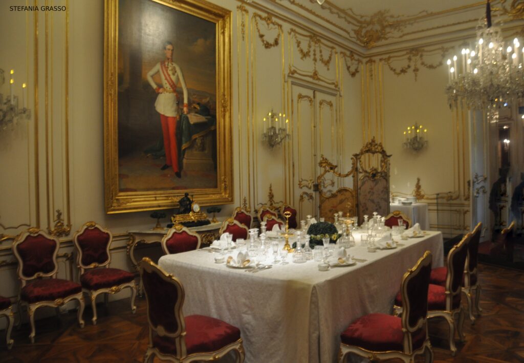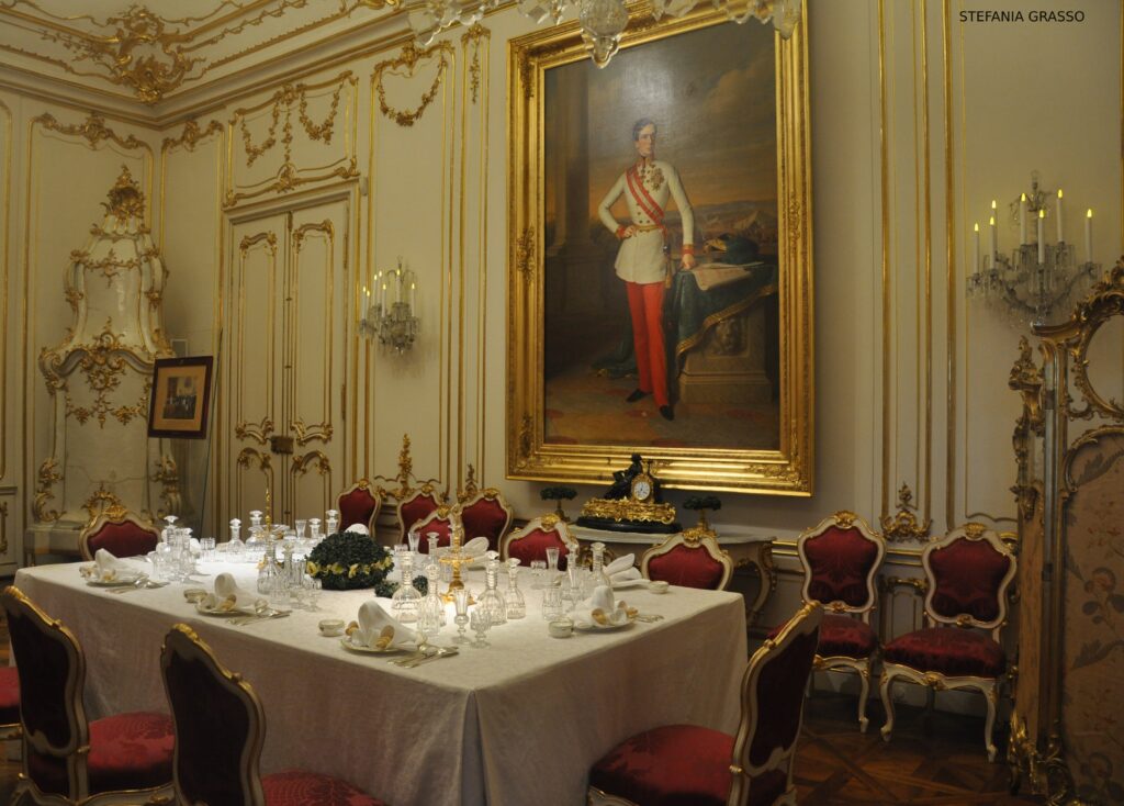 Camera di Maria Antonietta, sala da pranzo della famiglia con predilezione per i piatti viennesi come il “Tafelspitz”. Arazzo donato da Napoleone III. Marie Antoinette Zimmer. Das Familienspeisezimmer mit einer Vorliebe für Wiener Gerichte wie „Tafelspitz“. Der Gobelin kam als Geschenk Napoleons III.