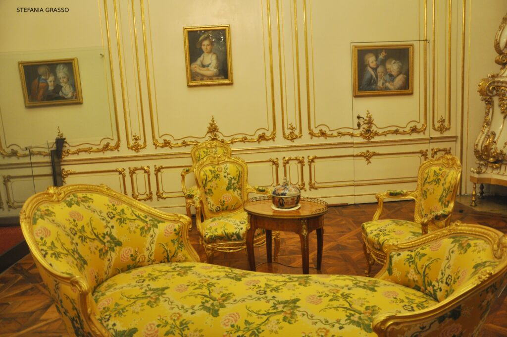 Salone giallo. Abbinamenti cromatici in bianco e oro, ritratti a pastello di Lion dei bambini borghesi. Gelber Salon mit einer Farbakkord Weiß und Gold. Bürgerlicher Kinder, die der Maler Lion in Pastellbildnisse porträtierte.