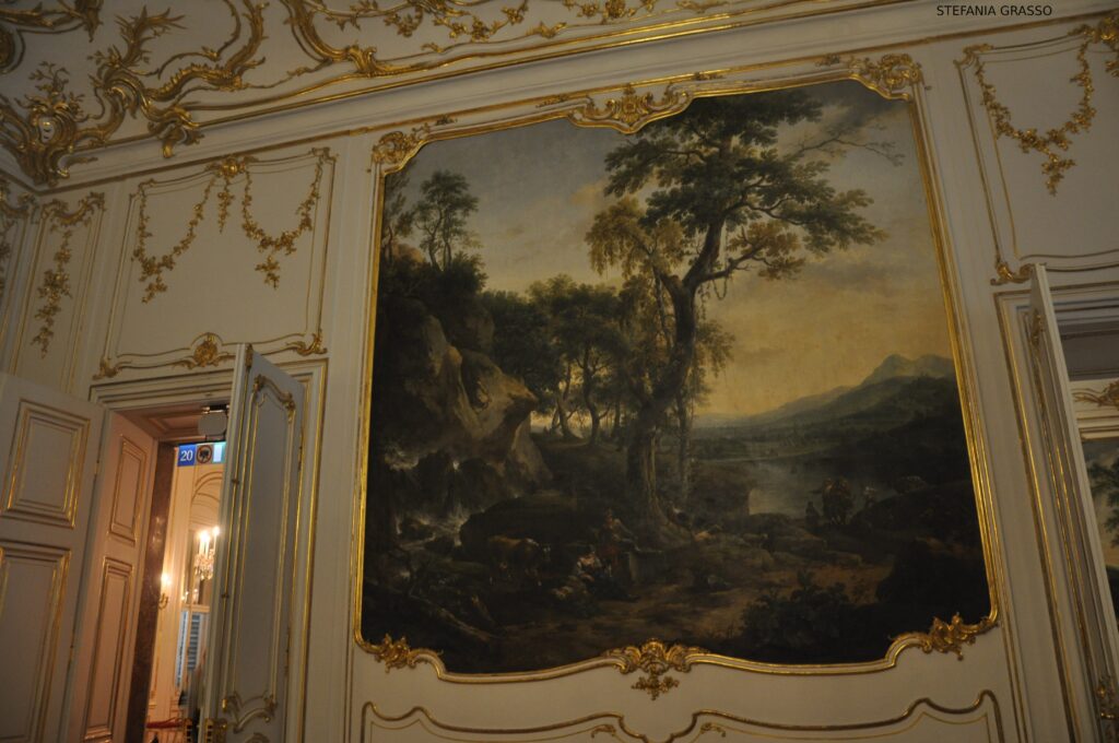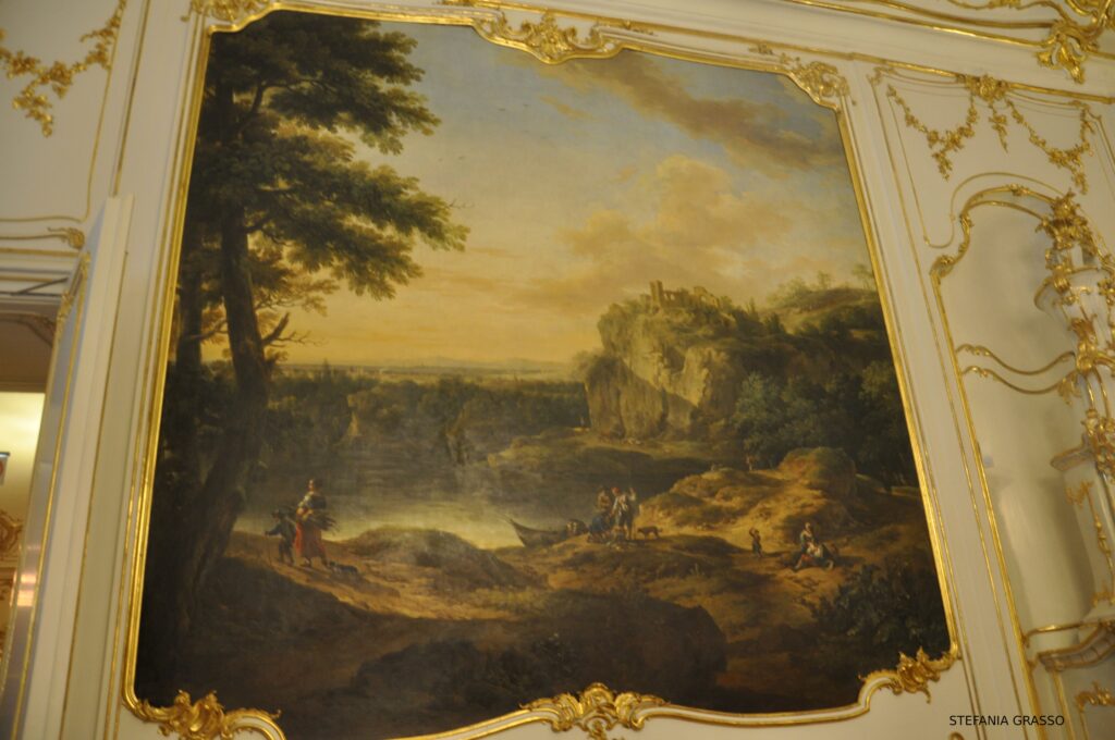 Salone di Rosa. Deriva dal nome del pittore Joseph Rosa, alla corte di Maria Teresa con dipinti che raffiguravano paesaggi idealizzati. Rosa-Zimmer leitet sich vom Namen des Malers Joseph Rosa ab, der am Hof von Maria Theresia mit Gemälden über idealisierte Landschaften