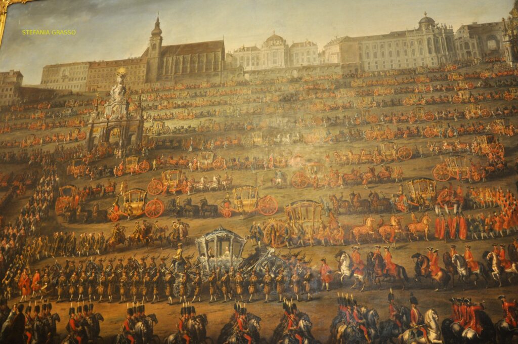 Stanza del Carosello. Carosello di dame intente a mostrare la loro abilità nel montare cavalli e guidare carrozze. Dipinti sul conferimento dell’ordine di S.Stefano, di Carlo VI, Elisabetta Cristina, i genitori di Maria Teresa. Das Karussellzimmer. Es zeigt die Geschicklichkeit mit Pferd und Wagen unter Beweis stellten. Die Porträtgemälde an zeigen die Eltern von Maria Theresia, Karl VI und Elisabeth Christine.