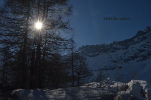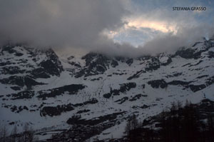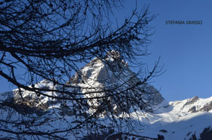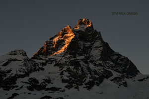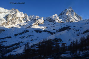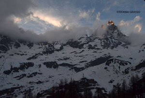Il Sole accende di fuoco il meriggio, estingue la fiamma dell’ira, i gracchi alpini scendono di 500 metri e si posano sulla neve, lieto trascorre il giorno in piena armonia e serenità fino alla magia della quiete vespertina. Sembra che quella enorme palla splendente nel cielo non voglia mai tramontare e illumina ancora la cima del Cervino e la stazione della funivia di Plan Maison con spettacolari giochi di luce. Le strade ormai sono deserte, ognuno ritorna alla propria dimora. E’ da questo momento che il Silenzio della Sera diviene il miglior amico di sempre e da qui ci si rende conto che la vera fortuna non è il lusso, il denaro ma la possibilità di vivere in questi luoghi stabilmente tra le braccia amorevoli di Madre Natura piuttosto che in luoghi tristi, caotici, opprimenti, in ambienti meschini. Era chiedere troppo??