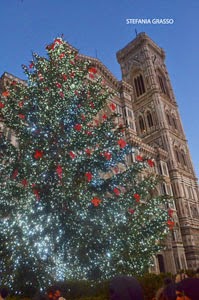 Ed ecco ripetersi brividi ed emozioni nel buio della sera davanti a Santa Maria del Fiore con l’albero di Natale illuminato di luci azzurre tra i gigli rossi sotto la luna piena. Davanti a lei si innalza maestoso il campanile più bello di mondo, quello di Giotto tra i contrasti celesti del vespro e si illumina dorata la cupola di Brunelleschi. Le immagini parlano da sole.