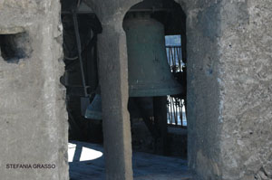 Tra la Chiesa e il Castello si trova l’antico campanile romanico del XII secolo costituito da una torre a pianta quadrata e un tetto con forma piramidale. Le campane sono collocate all’interno di strutture a bifora o trifora.