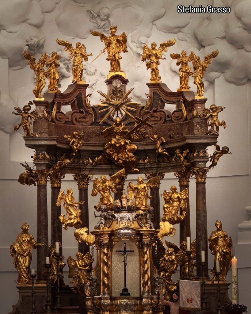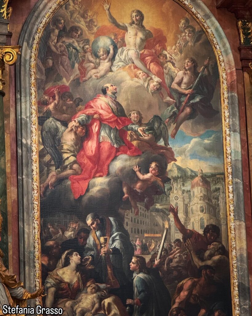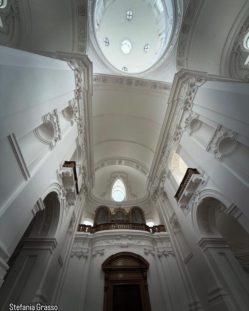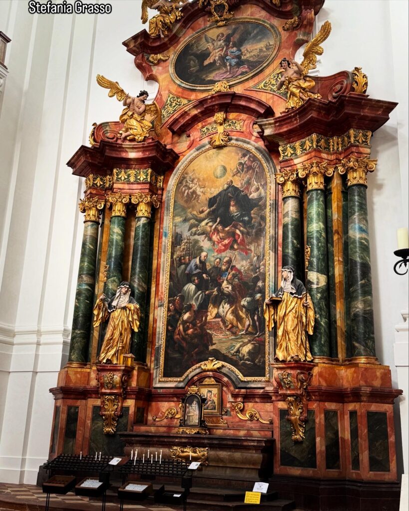 La guida locale ha poi optato per la visita della Kollegienkiche, la chiesa dell’Università. A seguire i dipinti all’interno dedicati alle varie facoltà, dalla Medicina alla Filosofia. L’edificio presenta uno stile misto tra Barocco e Rococò con una struttura interna ad ellisse con pianta centrale e cappelle laterali. Der örtliche Reiseleiter entschied sich für einen Besuch der Kollegienkirche, der Universitätskirche. Das Gebäude hat einen gemischten Stil zwischen Barock und Rokoko mit einer inneren Struktur mit einem zentralen Plan und seitlichen Kapellen. Nachfolgend sind die Gemälde im Inneren aufgeführt, die den verschiedenen Fakultäten von der Medizin bis zur Philosophie gewidmet sind.