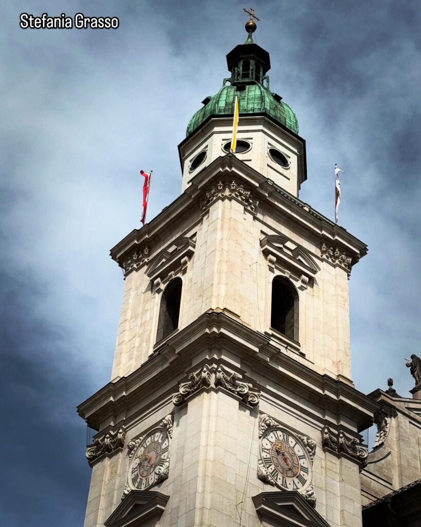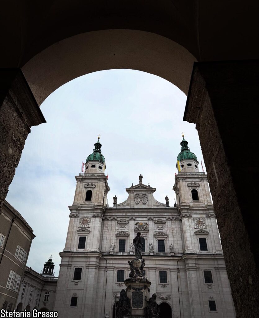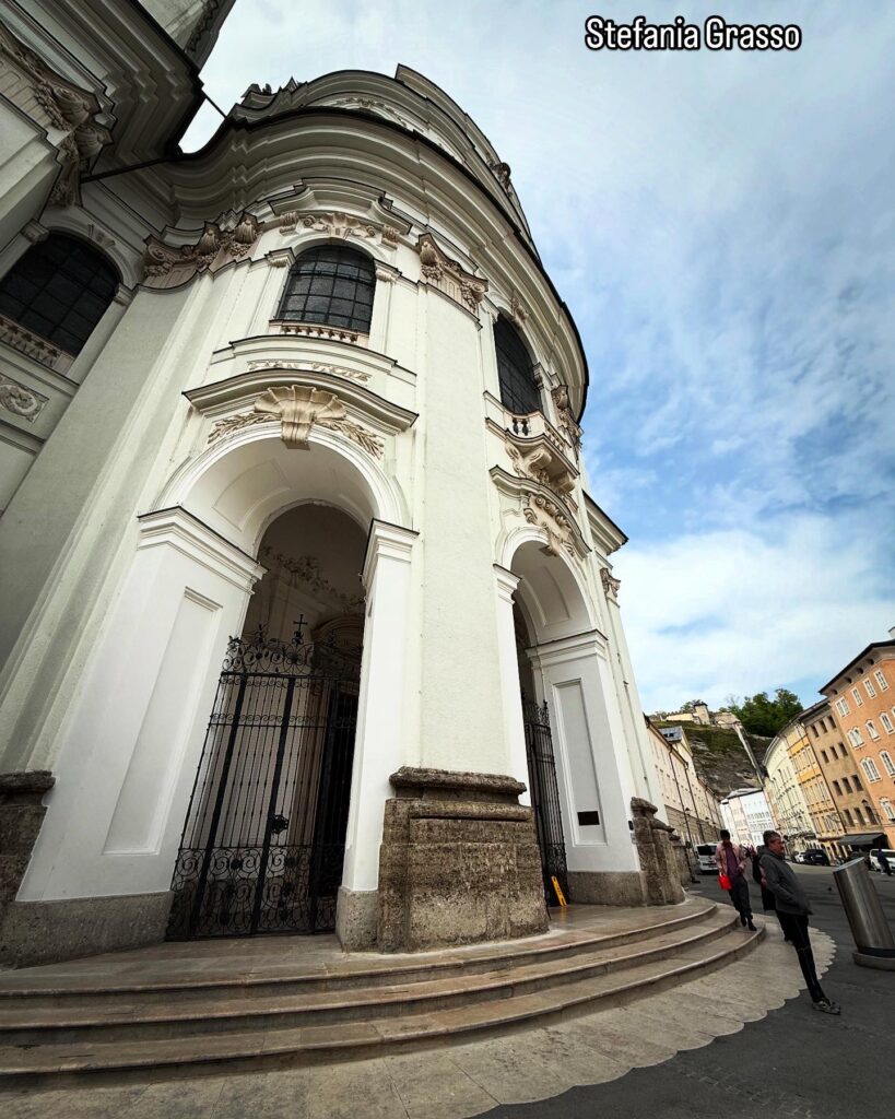 Visita all’esterno del Duomo dedicato ai Santi Ruperto e Virgilio. Facciata in marmo e calcare. Salzburger Dom der den Heiligen Ruperto und Virgilio gewidmet ist. Die prächtige barocke, marmorweiße Hauptfassade des Doms mit ihrem Programm ist nur aus der Nähe sichtbar.