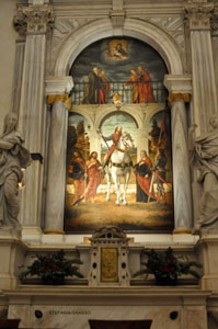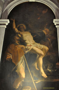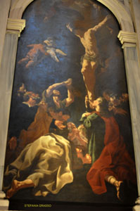 Concludo la descrizione del lato sinistro citando l’opera della pittrice Giulia Lama, il Crocifisso con gli Apostoli e San Sebastiano e Rocco del Trevisani