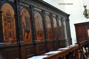 Nella navata destra è possibile osservare il coro intarsiato di San Domenico, la cappella dell’Immacolata e di San Girolamo quest’ultima attribuita a Lorenzo Costa, la cappella di San Lorenzo con la Pietà di Aspertini, la cappella di Santa Brigida con il polittico Garelli, la transenna marmorea con in cima due leoni e la cappella delle reliquie. Ve li propongo in ordine descritto.