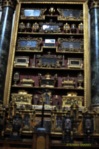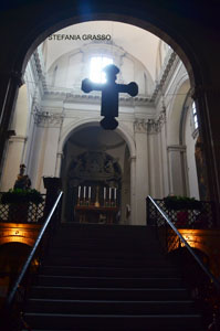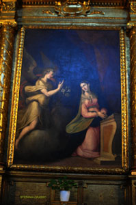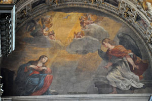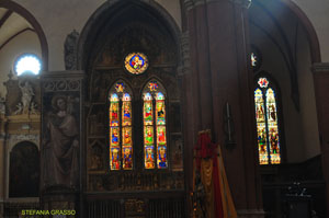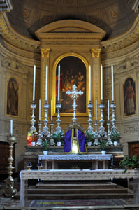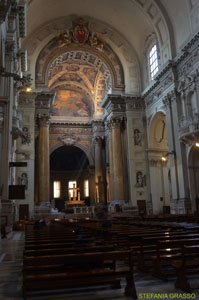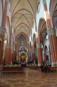 La navata centrale è luminosissima, si nota l’altare maggiore in marmi policromi realizzato da Torreggiani con volte a crociera al di sotto delle quali spicca l’Annunciazione di Carracci. Ai lati della porta i leoni che sorreggono l’acquasantiera. Bellissimo il raggio luminoso che attraversa il presbiterio, rende più sublime l’atmosfera, maggiore il raccoglimento in preghiera. L’architetto Torreggiani ha sistemato definitivamente l’interno dell’edificio verso il 1750.